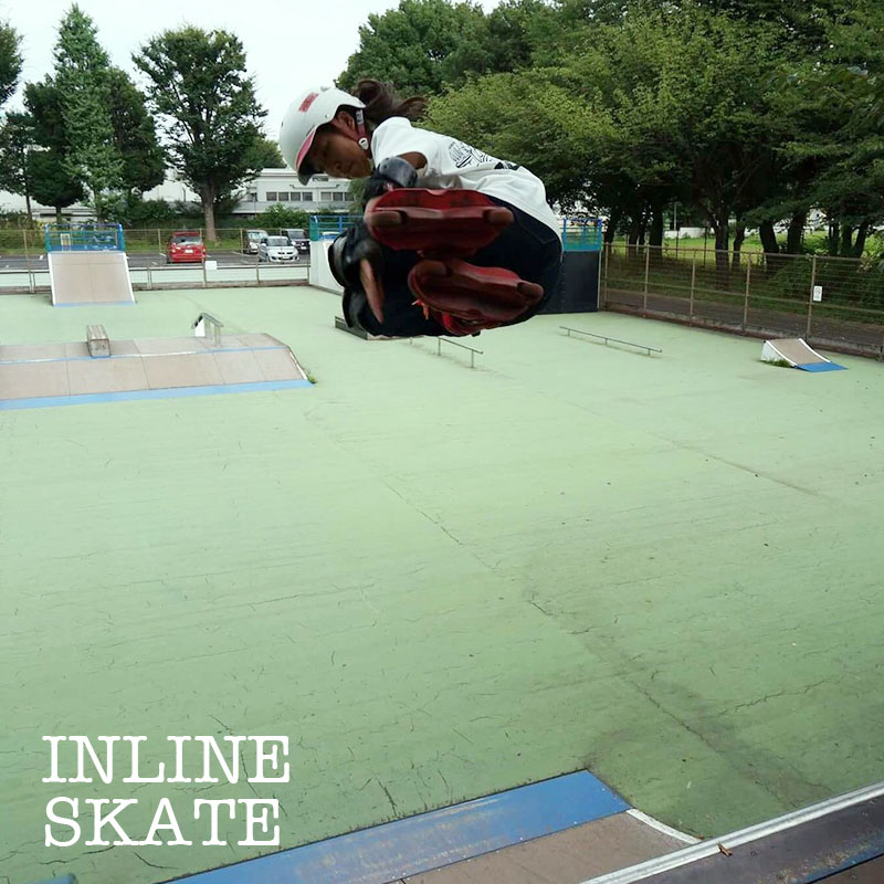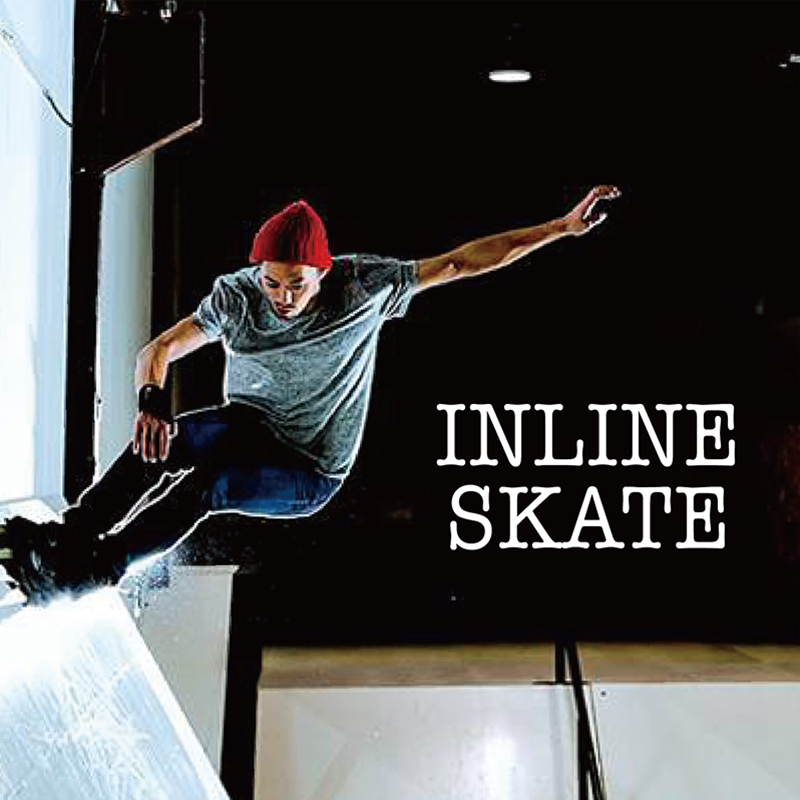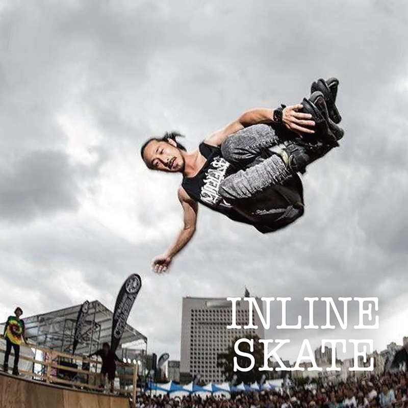 細いウィールを盾一列に通常は片側4輪配置したローラースケート。アグレッシブインラインスケートと呼ばれるランプ内で回転するなど技を披露する競技。